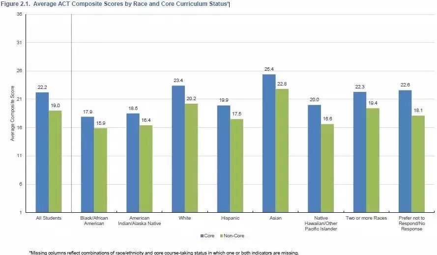 另外,参加过美国高中核心课程的考生(蓝色柱)具有明显的优势,这其中,又是以亚裔考生最为突出(最高的那个)……