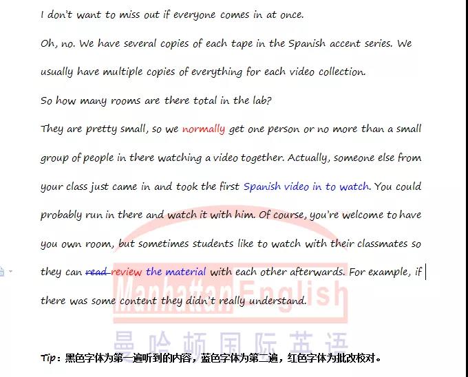 每次布置学生做听抄练习时,曼哈顿的助教小姐姐/小哥哥都会再三强调听抄要求:建议听三遍音频,将听到的内容写下来。每一遍都要用不同颜色的字体标注。比如第一遍听懂的内容用黑色字体写,第二遍听到的再用蓝色字补充上去,以此类推。听完后再参考听力文本,用红色字校对。